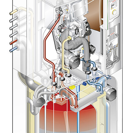 Pri hranilnikih WAS Power 80 in WAS Power 115 ogrevanje sanitarne vode poteka s pomočjo ploščnega toplotnega prenosnika iz nerjavnega jekla, ki se napaja prek črpalke za polnjenje hranilnika. Ta po eni strani nudi visoko prenosno zmogljivost, po drugi strani pa nizka temperatura povratnega toka pri pripravi tople vode pomeni, da kondenzacijski kotel kondenzira tudi pri pripravi tople vode. Kompaktni kotel z 80-litrskim hranilnikom je visok samo 157 cm, zato jo je mogoče postaviti tudi v nizke kletne ali podstrešne prostore.